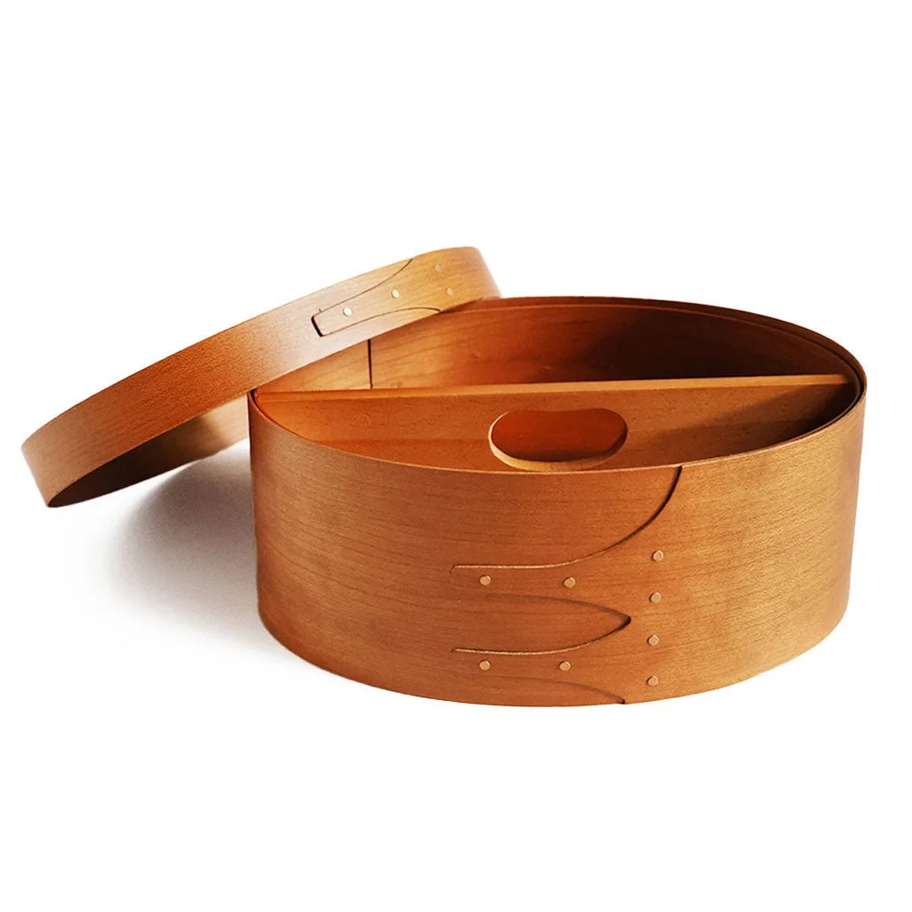 This oval-shaped sewing box was inspired by a shaker box. Handcrafted of cherry wood, it features two tier storage and can be used as a sewing kit, a small project box, a jewelry box, or a box for small collectibles.